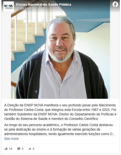 “A Direção da ENSP NOVA manifesta o seu profundo pesar pelo falecimento do Professor Carlos Costa, que integrou esta Escola entre 1987 e 2023. Foi também Subdiretor da ENSP NOVA, Diretor do Departamento de Políticas e Gestão do Sistema de Saúde e membro do Conselho Científico. Ao longo do seu percurso académico, o professor Carlos Costa destacou-se pela dedicação ao ensino e à formação de várias gerações de administradores hospitalares, tendo igualmente exercido funções como Diretor do Curso de Especialização em Administração Hospitalar”, pode ler-se.