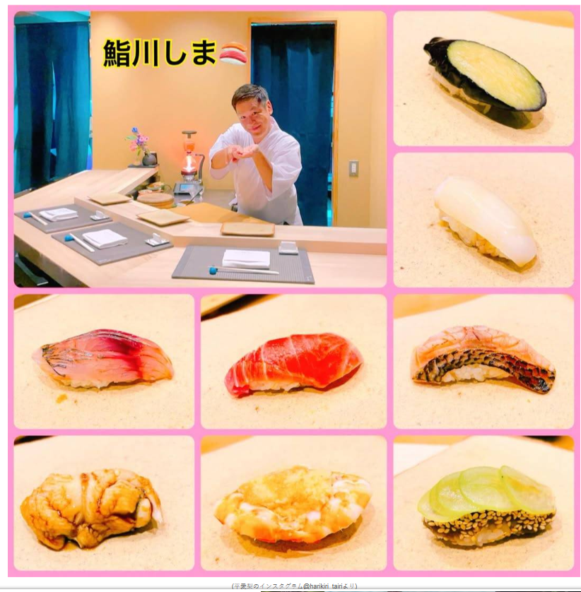 「川島がお寿司始めたってよ!!」と書き出し、「こんな嬉しい情報が舞い込んでくるとは‼︎出汁ソムリエとは知っていたけれどお寿司まで握れるだなんて全く知らなかった‼︎なんというサプライズ 早速お店に行かせて頂くと本当に川島氏がお出迎えしてくれた‼︎」とつづり、カウンターのから鮨を握っているお笑いコンビ「はんにゃ」の川島章良の姿をアップ。提供されたとみられるお寿司や一品料理も添えている。